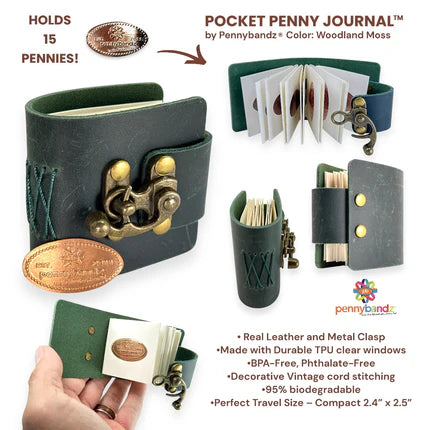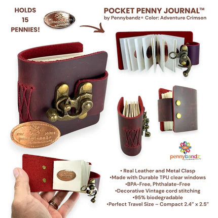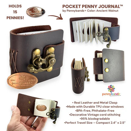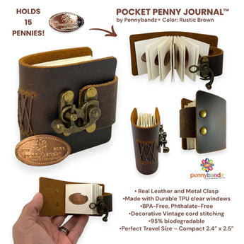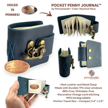 Introducing the Pocket Penny Journal™ by Pennybandz®, a stylish, compact solution for preserving and showcasing pressed pennies. Crafted with premium leather and built for durability, this elegant journal holds up to 12 pressed pennies in a pocket-sized format, making it perfect for collectors on the go. As the most earth-friendly penny book ever made, it’s crafted with 95% biodegradable materials, offering sustainability without sacrificing style. It’s more than a mini journal—it’s a timeless keepsake that pairs functionality with sophistication.